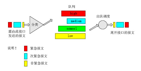 在報文到達路由設(shè)備接口后首先對報文進行分類,然后按照報文所屬的類別讓報文進入所屬隊列的尾部,在報文發(fā)送時按照優(yōu)先級總是在所有優(yōu)先級較高的隊列中的報文發(fā)送完畢后再發(fā)送低優(yōu)先級隊列中的報文,這樣在每次發(fā)送報文時總是將優(yōu)先級高的報文先發(fā)出去,保證了屬于較高優(yōu)先級隊列的報文有較低的時延與丟失率。