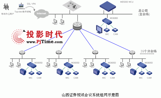 本套系統(tǒng)采用H3C ME5000 MCU+MG6060+MG6050的組網(wǎng)模式,總公司會(huì)場采用1臺(tái)MG6060,營業(yè)部會(huì)場采用39臺(tái)MG6050,實(shí)現(xiàn)了2M帶寬下的高清會(huì)議的連接,系統(tǒng)構(gòu)架圖如下: