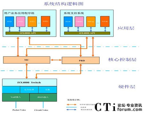 MC是整個的系統(tǒng)控制核心,其完成對iSX4000 交換機的所有控制功能,包括系統(tǒng)配置管理、呼叫控制、媒體網關控制和媒體資源管理等。應用層的業(yè)務應用程序發(fā)起的所有控制命令,通過MC路由到指定的iSX4000交換機上,并由iSX4000交換機最終完成指定的操作,而操作的結果最終通過MC,返回給業(yè)務應用程序。同理,由iSX4000交換機發(fā)起的控制信號,亦是通過MC來派發(fā)給特定的業(yè)務應用程序,業(yè)務應用程序處理后,通過MC反饋給iSX4000交換機。