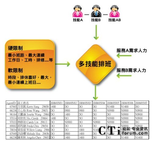 在實(shí)施人資優(yōu)化軟件之后,呼叫中心即可開始對(duì)各服務(wù)人力作"量"與"質(zhì)"的管理,確定資源做最佳運(yùn)用,如下圖所示: