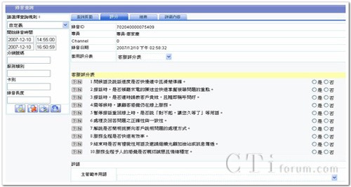 呼叫中心質(zhì)量管理最重要的工作之一,就是評核各類型業(yè)務電話服務的質(zhì)量。為了要做到公平與公正,質(zhì)檢樣本的篩選不只要相同業(yè)務服務內(nèi)容,更要相同的 環(huán)境條件,例如:不同業(yè)務類別(成交電話篩選、抱怨電話篩選)、日期(尖峰日電話篩選、離峰日電話篩選)提供公平的選擇基礎(chǔ)作為評核的樣本,不因隨機取樣造成對客服人員整體績效評估失之偏頗。即便呼叫中心因應企業(yè)策略產(chǎn)生新的業(yè)務服務時,QMS8100KS可充分整合前端應用系統(tǒng)的改變,可依據(jù)所需的篩選條件組合或與CTI整合后的篩選字段,完成交叉錄音檔案篩選。