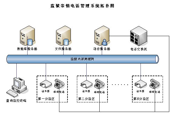 親情電話管理系統(tǒng)在系統(tǒng)設(shè)計(jì)中充分考慮監(jiān)獄的需求與特點(diǎn),不但包含了一般親情電話錄音所需的全部功能,而且還融合了獄政管理的功能,整個(gè)系統(tǒng)采用集中式方式,在中心機(jī)房部署一套親情電話錄音服務(wù)器,各個(gè)監(jiān)區(qū)監(jiān)控系統(tǒng)利用監(jiān)獄內(nèi)部的局域網(wǎng)聯(lián)結(jié)成一個(gè)整體,形成一個(gè)能監(jiān)控監(jiān)獄親情電話的全網(wǎng)。這樣即可以在每個(gè)監(jiān)區(qū)監(jiān)聽,也可以在監(jiān)獄內(nèi)部網(wǎng)的任何地方對(duì)親情電話進(jìn)行全程監(jiān)視。該系統(tǒng)能夠完全滿足目前監(jiān)獄的需求,產(chǎn)品性價(jià)比遠(yuǎn)遠(yuǎn)高于市場(chǎng)上其他同類產(chǎn)品。