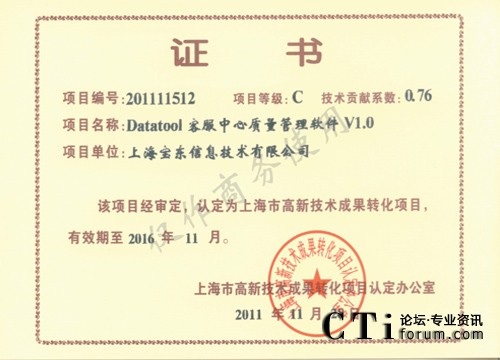 CTI論壇(ctiforum)12月7日消息(記者 張潔):2011年的最后一個(gè)月,寶東公司傳來又一好消息,公司的開發(fā)團(tuán)隊(duì)自主開發(fā)研制的針對呼叫中心客服的質(zhì)檢軟件“Datatool 客服中心質(zhì)量管理軟件(簡稱DTQM)”經(jīng)過市高新技術(shù)轉(zhuǎn)化項(xiàng)目認(rèn)定辦公室層層審報(bào)審批,最終經(jīng)審定,被認(rèn)定為市高新技術(shù)成果轉(zhuǎn)化項(xiàng)目。