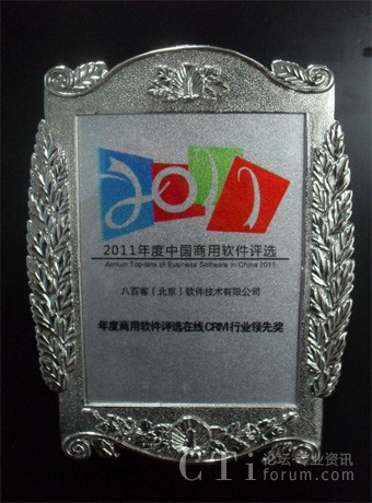 CTI論壇(ctiforum)12月20日消息(記者 張潔): 12月9日,以“模式創(chuàng)新帶動產業(yè)及應用轉型”為主題的“信息化領袖峰會暨商用軟件評選頒獎大會”在上海隆重舉行。本次大會分四個環(huán)節(jié)進行,其中最重要的環(huán)節(jié)莫過于揭曉“2011年度中國商用軟件評選”結果,作為全球領先的企業(yè)管理軟件供應商八百客(www.800app.com)成功斬獲2011年度中國商用軟件評選“在線CRM行業(yè)領先獎”。同時,八百客的三位企業(yè)用戶美國宣偉涂料公司的潘總、上海企盈投資管理有限公司的何總、華圖教育的王總分別獲得 “2011年度信息化貢獻人物獎”大獎。