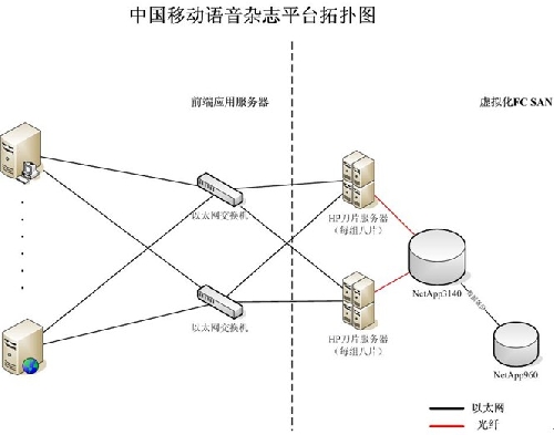 其中,NetApp FAS3140 配有 6 個(gè) 450GB 的 FC 磁盤和兩個(gè) 300GB FC 磁盤,裸容量為 46TB,用于運(yùn)行中國移動(dòng)的語音雜志業(yè)務(wù),采用 Socket 連接。NetApp FAS2050 則內(nèi)置有 12 塊1TB SATA 磁盤,裸容量為 12TB,主要用于測試高陽公司 Oracle 數(shù)據(jù)庫和網(wǎng)站應(yīng)用等。