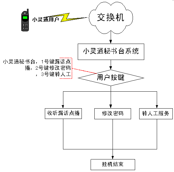 當(dāng)主叫用戶撥打被叫小靈通用戶,而被叫小靈通用戶處于不可達(dá)(關(guān)機(jī)、忙、不在服務(wù)區(qū))狀態(tài)時(shí),該呼叫自動(dòng)轉(zhuǎn)入轉(zhuǎn)到小靈通秘書臺(tái)系統(tǒng)后,用戶選擇2號(hào)鍵,系統(tǒng)會(huì)將此來(lái)話轉(zhuǎn)入人工臺(tái),由人工秘書為此主叫服務(wù)。