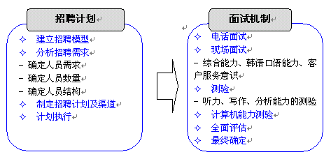東軟呼叫中心充分挖掘東北地區(qū)豐富的韓語(yǔ)人才資源,通過(guò)多種招聘渠道滿足項(xiàng)目的人才需求。東軟自身的教育機(jī)構(gòu)--東軟信息學(xué)院也可以培養(yǎng)專業(yè)的韓語(yǔ)人才,另外,東軟信息學(xué)院與韓國(guó)某大學(xué)進(jìn)行戰(zhàn)略合作,通過(guò)為韓國(guó)留學(xué)生提供呼叫中心實(shí)習(xí)機(jī)會(huì)及漢語(yǔ)培訓(xùn)等,方式,吸引數(shù)名高素質(zhì)韓國(guó)大學(xué)生加入呼叫中心,充分滿足該項(xiàng)目對(duì)專業(yè)人才的需求。