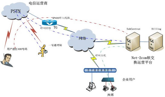 - 普通用戶通過固話、移動電話撥打400號碼,話務通過電信網(wǎng)中繼網(wǎng)關(guān)IP網(wǎng)軟交換平臺,由軟交換平臺為400號碼制定被叫實體終端;