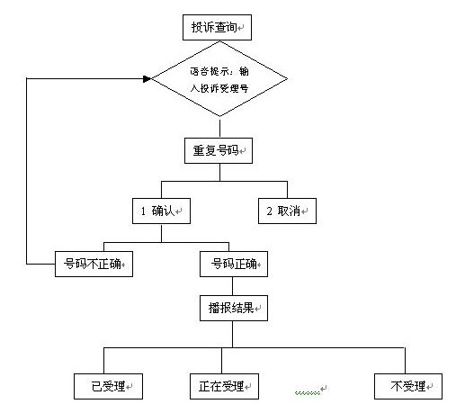 通過自動臺,輸入自己的投訴序號查詢投訴處理結果,自動投訴處理結果查詢流程如下: