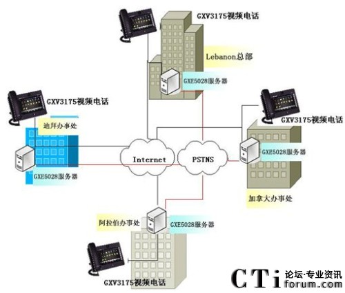 在Tabbara公司的全球四個辦事處分別安裝潮流網(wǎng)絡的GXE5028 IPPBX服務器或者其他的SIP Sever通信平臺,GXE5028 IP PBX支持語音信箱,郵件和其他通信功能應用,每一臺GXE5028最大限度地支持分布全球辦事處的所有通信賬號同時連接到同一網(wǎng)絡中,終端連接IP電話,IP視頻電話以及IP視頻監(jiān)控攝像機作為語音/數(shù)據(jù)的輸入輸出,當然IP PBX也可通過網(wǎng)絡連接到VoIP服務器中間位置的SIP中繼。潮流網(wǎng)絡的GXV3175多媒體觸摸屏視頻電話,支持標準的SIP協(xié)議,先進的H.264/H.263/H.263+視頻壓縮標準,寬大的7寸彩色觸摸顯示屏實現(xiàn)溝通面對面的零距離交流,以及撥打網(wǎng)絡攝像機觀看監(jiān)控現(xiàn)場。潮流網(wǎng)絡的GXV3662_HD高清防暴半球IP攝像機和GXV3651_HD IP攝像機,分別安裝在辦事處關鍵位置,365天,每周24*7個小時進行實時監(jiān)控,作為企業(yè)財產(chǎn)和人員安全的保障。方案中,各分支機構之間通話免費,撥打分支機構所在地其他電話按市話費算,出差人員使用IP電話與公司內部通話免費。