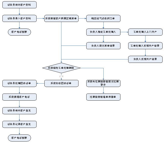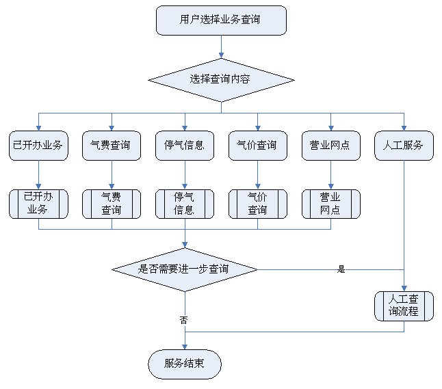 1)業(yè)務(wù)咨詢(xún):用戶(hù)通過(guò)人工、自動(dòng)語(yǔ)音等方式咨詢(xún)有關(guān)政策法規(guī)、資費(fèi)標(biāo)準(zhǔn)、用氣常識(shí)、報(bào)裝方法等,系統(tǒng)以語(yǔ)音、傳真、Email、短消息等方式回復(fù)客戶(hù)。