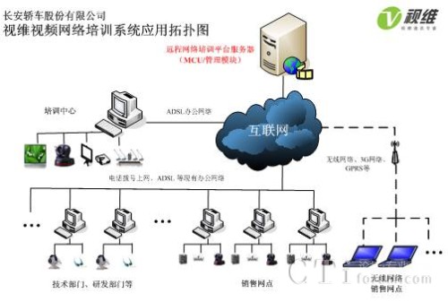 長安轎車大規(guī)模網(wǎng)絡(luò)遠(yuǎn)程會(huì)議和培訓(xùn)系統(tǒng)由服務(wù)器端和客戶端組成,服務(wù)器端軟件部署在重慶中心機(jī)房,中心機(jī)房配置1臺(tái)單獨(dú)服務(wù)器,支持400個(gè)客戶端同時(shí)在線,負(fù)責(zé)所有會(huì)議和培訓(xùn)的召集、音視頻交互、加密等工作,長安轎車各部門、轄下各零售點(diǎn)通過WEB方式(包括ADSL、3G無線等多種網(wǎng)絡(luò))即可實(shí)現(xiàn)客戶端軟件的自動(dòng)安裝與升級(jí),配備簡單的攝像頭和話筒之后就可以實(shí)現(xiàn)長安轎車以及400多零售點(diǎn)的大規(guī)模工作會(huì)議和高清音視頻網(wǎng)絡(luò)培訓(xùn)。網(wǎng)絡(luò)拓?fù)鋱D如下: