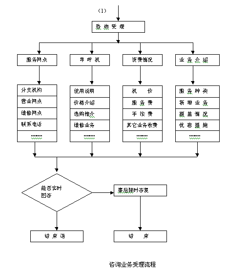 咨詢主要是回答客戶有關臺席各項業(yè)務種類、資費標準、服務網(wǎng)點及優(yōu)惠措施等問題,要求以自編數(shù)據(jù)庫或業(yè)務手冊為基礎,實時予以回答。一時無法解釋清楚的,建議客戶留下聯(lián)系電話,將由專人負責答復。
