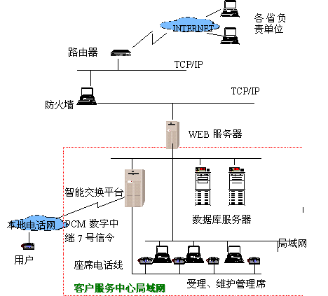 數(shù)據(jù)通信局的客戶遍布全國各地,建立一個(gè)覆蓋全國的客戶服務(wù)網(wǎng)絡(luò)勢在必行,因此我公司為之構(gòu)建了數(shù)據(jù)通信局客戶服務(wù)系統(tǒng),全國各地的各個(gè)客服中心的數(shù)據(jù)可以通過專線連接,語音也可以通過VOIP用數(shù)字專線連接,以降低長話費(fèi)用。該系統(tǒng)的投入使用,不但滿足了數(shù)據(jù)局為全國各地客戶服務(wù)的需要,而且可以收集客戶信息,不但降低了辦公費(fèi)用,而且有利于擴(kuò)大市場分額。數(shù)據(jù)通信客戶服務(wù)中心的主要目的是解決對全國大客戶的業(yè)務(wù)咨詢與申辦、障礙申告、投訴與建議的集中管理以及處理控制,系統(tǒng)采用800號接入,以一個(gè)小型的交換設(shè)備為座席電話分配點(diǎn),客戶撥入的電話,經(jīng)小型交換設(shè)備分配到空閑的座席上。