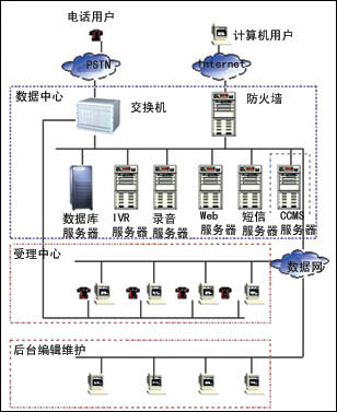 系統(tǒng)的體系結(jié)構(gòu),主要包括三個部分:數(shù)據(jù)中心、受理中心和維護(hù)中心。受理中心與數(shù)據(jù)中心之間采用E1連接,具有2M的數(shù)據(jù)通信能力;維護(hù)中心與數(shù)據(jù)中心之間采用64K DDN線路連接,三個中心分布在三個不同的地方。目前受理中心負(fù)責(zé)全省的所有業(yè)務(wù),客戶通過本地市話經(jīng)由移動電信網(wǎng)絡(luò)將話路指向受理中心,通過數(shù)據(jù)中心的具有排隊功能的交換機,根據(jù)被叫號碼和客戶服務(wù)要求,將講話路轉(zhuǎn)接到自動臺或人工臺席,為客戶提供服務(wù)。當(dāng)用戶呼叫信息臺電話后,進(jìn)入到交換機,交換機將來話消息通知驅(qū)動池,驅(qū)動池將相關(guān)消息轉(zhuǎn)換為標(biāo)準(zhǔn)格式,通知CCMS,CCMS根據(jù)來話被叫號,根據(jù)管理系統(tǒng)的定義,啟動相應(yīng)的IVR腳本,交給IVR解釋器解釋并由IVR服務(wù)器執(zhí)行,當(dāng)服務(wù)為自動臺完成時,由IVR服務(wù)器實現(xiàn)(如:語音引導(dǎo)、適合自動服務(wù)的內(nèi)容等);當(dāng)用戶需要人工服務(wù)時,CCMS管理系統(tǒng),根據(jù)用戶的服務(wù)要求,按照話路分配原則(通過管理系統(tǒng)定義),選擇最合適的話務(wù)員為其服務(wù),同時CCMS管理系統(tǒng)會將相關(guān)的頁面在話務(wù)員的臺席上顯示出來,同時顯示主叫號碼以及來話標(biāo)示,當(dāng)話務(wù)員應(yīng)答后,即可開始受理,受理的內(nèi)容通過Web服務(wù)器完成,同時對于需要查詢數(shù)據(jù)庫的訪問,通過應(yīng)用服務(wù)器,進(jìn)行數(shù)據(jù)訪問,并返回結(jié)果。當(dāng)服務(wù)完畢,本次呼叫即結(jié)束。