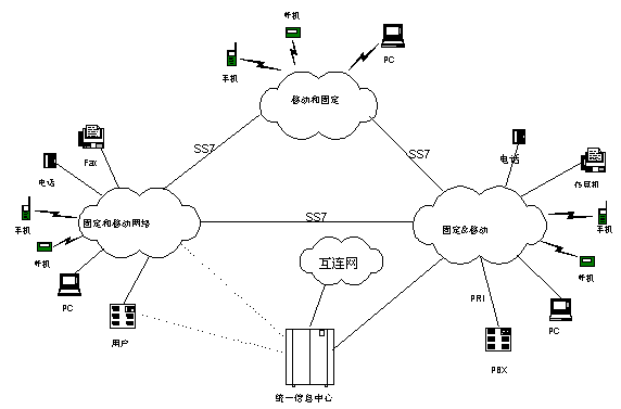 在圖中所示的組網(wǎng)圖中,包括了目前經(jīng)常使用的多種通訊方式。UMS統(tǒng)一信息系統(tǒng)在其中位于核心的位置。通過(guò)UMS,各種通訊方式具有了信息互通的轉(zhuǎn)發(fā)和接入點(diǎn),用戶(hù)可以通過(guò)任何一種通信方式接入到UMS中,從中提取或發(fā)送信息。