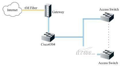 客房局域網(wǎng)通過(guò)一條6M的光纖接入CNC網(wǎng)絡(luò),網(wǎng)關(guān)設(shè)備承擔(dān)了DHCP、NAT和流量限制等功能,同時(shí)在思科6504上安裝有安全板卡,對(duì)內(nèi)部網(wǎng)絡(luò)安全進(jìn)行加強(qiáng)和防御。由于每個(gè)客房有2~3個(gè)信息點(diǎn),客房局域網(wǎng)總共有1300個(gè)左右的信息點(diǎn)。