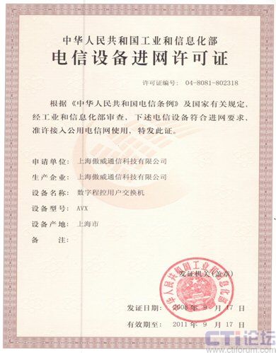 近日,國(guó)內(nèi)知名的VOIP全系列產(chǎn)品和解決方案提供商---傲威通信科技有限公司,自主研發(fā)的AVX系列語(yǔ)音電話交換機(jī)順利通過(guò)工業(yè)與信息化部審核,取得“電信設(shè)備進(jìn)網(wǎng)許可證”。此舉標(biāo)志著傲威通信的AVX系列產(chǎn)品已成功取得接入國(guó)家電信網(wǎng)的資質(zhì),為大規(guī)模的推廣應(yīng)用打下了堅(jiān)實(shí)基礎(chǔ)。