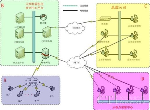 方案二:400電話+托管呼叫中心平臺(tái)+坐席統(tǒng)一部署在總部