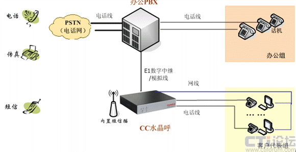 CC水晶呼單獨組網(wǎng),對外接運營商的電話線,對內(nèi)接分機線,組網(wǎng)說明如下: