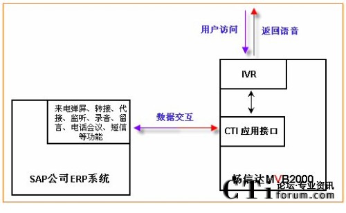 通過(guò)集成,不但可以實(shí)現(xiàn)與SAP公司ERP系統(tǒng)的實(shí)時(shí)數(shù)據(jù)傳輸,實(shí)現(xiàn)客戶管理、日常辦公,并且可使ERP系統(tǒng)上具有:點(diǎn)擊外呼、批量外呼、來(lái)電彈屏、收聽(tīng)錄音、查看報(bào)表、監(jiān)控電話線路等更多增值功能,詳細(xì)接口內(nèi)容見(jiàn)《MVB2000