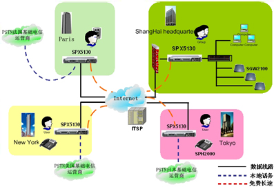 隨著公司在全世界開設(shè)眾多的部門,IP電話技術(shù)將會是不同分公司之間實現(xiàn)低費用高品質(zhì)語音通訊的方式。SINOCO公司的IP-PBX 系統(tǒng)解決方案,利用 SPX-5130設(shè)備通過互連網(wǎng)連接到公司的各個分支機構(gòu),提供分級體系結(jié)構(gòu),更進(jìn)一步提供了可靠的,靈活的語音通訊解決方案,從而滿足公司快速回應(yīng)客戶的需求。同時,它也降低了總部和分部之間的電話費用。總部和分部間昂貴的國際電話費用將不再存在, 而且享受高品質(zhì)的語音通訊質(zhì)量。