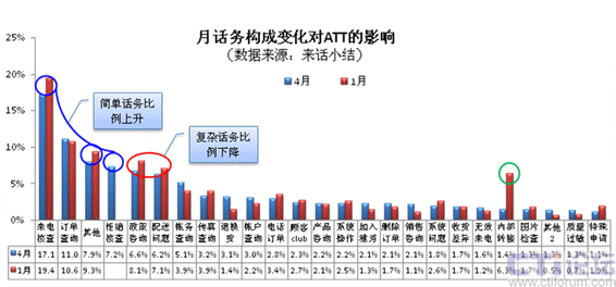 從圖12也可以明顯的看出:ATT“月末彈起”現象的原因同樣是“簡單話務比例的下降必然帶來整體ATT的上升;復雜話務比例的上升也必然帶來整體ATT的上升”;具體因為Avon調整了業(yè)務政策,從3月開始,每月27日18:00后至月末NCC不受理來電核查,因此該類話務從27日的25%左右突降為0;拒絕核查的量比也有-7%的大幅下降(從12%下降到5%以下);而復雜業(yè)務如政策咨詢、配送問題則有+6%的較大幅度上升(約從10%上升到16%)。