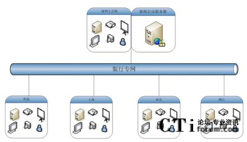 如圖,大新銀行視頻會議系統(tǒng)應用規(guī)模為5個點,包括香港、深圳、上海、南京、鎮(zhèn)江,服務器部署在深圳用來保證香港和內(nèi)地的鏈接效果,服務器出口帶寬為5M共享,各分會場通過專網(wǎng)訪問服務器。在這個網(wǎng)絡平臺上,紅杉樹網(wǎng)絡視頻會議所提供的高質(zhì)量音視頻圖像、方便易用的文檔、文件共享數(shù)據(jù)功能,使得大新銀行能夠在這個平臺上進行從桌面討論到會議室正式會議等各種規(guī)模的應用。在這個平臺上,除了進行日常例會、業(yè)務交流等常見的應用之外,業(yè)務培訓、異地招聘等也是經(jīng)常進行的內(nèi)容。業(yè)務人員利用數(shù)據(jù)功能,把平常培訓很難懂的新銀行產(chǎn)品、費率等進行介紹,節(jié)約了以前培訓所花費的大量精力和時間,為新產(chǎn)品迅速占領市場掌握了主動。