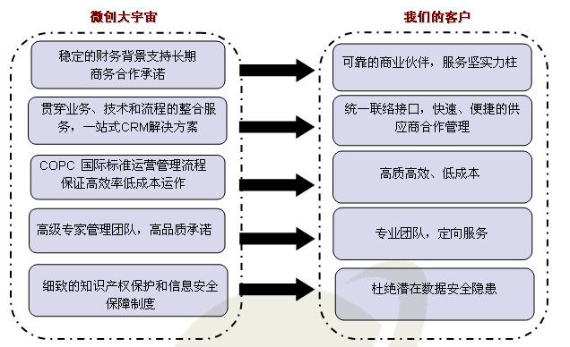 Wicresoft 微創(chuàng)軟件是上海聯(lián)和投資有限公司控股的國家重點軟件企業(yè),是微軟公司在華最重要的投資項目之一。自2002年5月成立以來,本著“迅捷、誠信、盡責,打造值得信賴的國際化IT外包與服務(wù)提供商”的愿景,微創(chuàng)一直專注于信息技術(shù)外包(ITO)和業(yè)務(wù)流程外包(BPO)領(lǐng)域,不斷積累豐富的先進技術(shù)、細致高效的流程管理、靈活調(diào)配的規(guī)模化專業(yè)人員,旨在為客戶提供度身定制的高績效專業(yè)服務(wù),打造完美客戶體驗。
