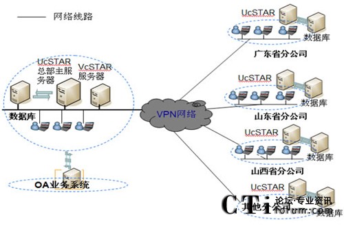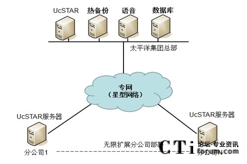 在公司總部部署主UcSTAR服務器,全國省級分公司分別部署一套子UcSTAR服務器,組成星型結構公司內部的溝通與協(xié)作系統(tǒng)。