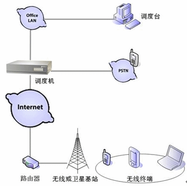調度機通過有線網(wǎng)絡連接到各無線基站或衛(wèi)星地面站,利用原有的調度功能,可對各種無線終端進行調度。目前除了衛(wèi)星以外,還可利用WiFi、SCDMA等無線技術,根據(jù)使用范圍的大小來選擇不同的無線網(wǎng)絡。