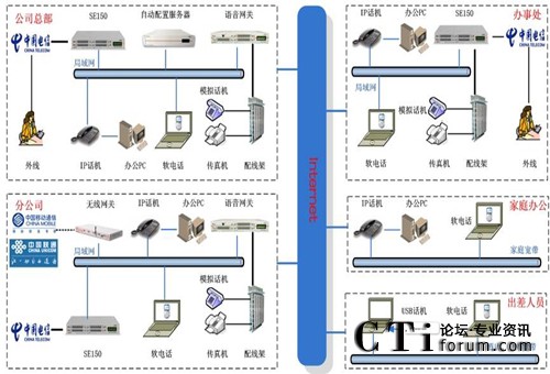 - 分布式部署:總部和各分支機(jī)構(gòu)的分機(jī),是通過IP網(wǎng)絡(luò)融合在一個(gè)語音平臺(tái)上來實(shí)現(xiàn)內(nèi)部通信。總部和辦事處分機(jī)、家庭辦公分機(jī)、出差人員的軟電話均注冊(cè)在總部的SE150上,各分公司的分機(jī)注冊(cè)在本地的SE150上,由本地的SE150管理。