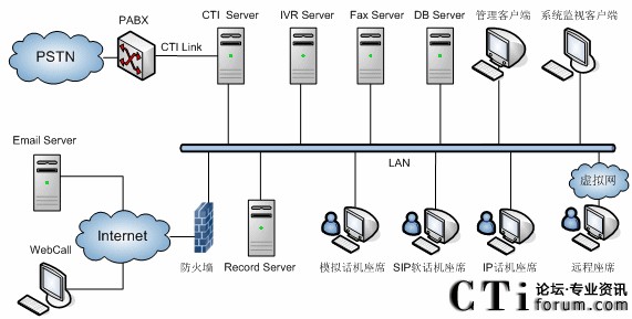| 11 | CTI Sevrer | 電腦電話應(yīng)用服務(wù),聯(lián)絡(luò)中心通過(guò)CTI服務(wù)實(shí)現(xiàn)呼叫控制,呼叫技能路由等 |