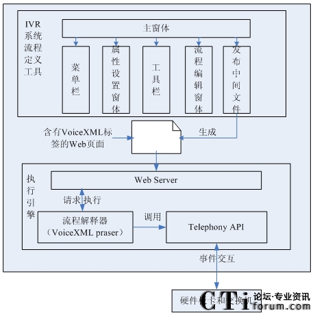 IVR系統(tǒng)執(zhí)行引擎作為IVR系統(tǒng)的核心,是整個(gè)系統(tǒng)的控制中樞。它所完成的功能是對(duì)IVR系統(tǒng)業(yè)務(wù)流程的解釋和驅(qū)動(dòng)。