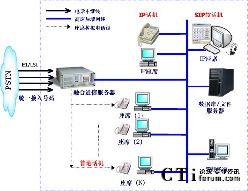 交換機方案主要由PBX/IPPBX交換機提供前段接入交換設備,后端計算機應用系統(tǒng)通過CTI Link與交換機交互和通信,并實現(xiàn)CTI控制;