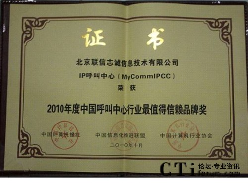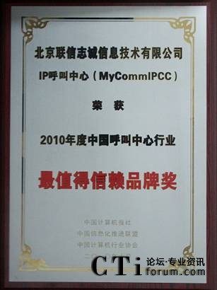 CTI論壇(ctiforum)11月1日消息(記者 潘婷婷):近日,在國家信息化專家咨詢委員會的指導(dǎo)下,作為中國信息化發(fā)展重要推動力量的中國計(jì)算機(jī)報(bào)社、中國計(jì)算機(jī)行業(yè)協(xié)會、中國信息化推進(jìn)聯(lián)盟等國家級權(quán)威媒體及國家信息化領(lǐng)域一級權(quán)威機(jī)構(gòu),共同組織開展“2010中國行業(yè)信息化讀者選擇獎評選”,重點(diǎn)展示信息化在行業(yè)應(yīng)用中的優(yōu)秀應(yīng)用案例、產(chǎn)品及解決方案。由中國計(jì)算機(jī)報(bào)社組織業(yè)內(nèi)專家,在經(jīng)過歷時(shí)3個(gè)月的產(chǎn)品征集、方案論證、專家評審后,北京聯(lián)信志誠信息技術(shù)有限公司(簡稱MyComm公司),其核心產(chǎn)品MyCommIPCC獨(dú)占2010年中國呼叫中心行業(yè)最值得信賴品牌獎。