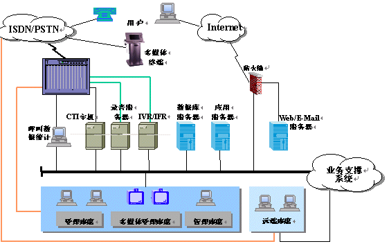 系統(tǒng)主要組成部分有呼叫匯接平臺(tái)、語音/傳真服務(wù)平臺(tái)、座席應(yīng)用平臺(tái)、Internet服務(wù)平臺(tái)、數(shù)據(jù)支撐平臺(tái)、網(wǎng)絡(luò)支撐平臺(tái)。