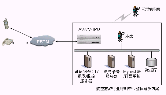 本方案采用AVAYA IP OFFICE系列交換機(jī),通過訊鳥中間件控制整個(gè)呼叫中心的電話呼入、呼出。它支持多種聯(lián)絡(luò)渠道,包括語音、交互式自動(dòng)語音應(yīng)答(IVR)、傳真、電子郵件、web、短消息等,同時(shí)利用Myair航空管理系統(tǒng)來完成整個(gè)業(yè)務(wù)流程。