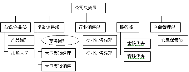 除分銷渠道管理之外,紫光網(wǎng)聯(lián)的前端管理組織機(jī)構(gòu)還包括市場(chǎng)/產(chǎn)品部、行業(yè)銷售部、服務(wù)部和倉儲(chǔ)管理部門。示意圖如下:
