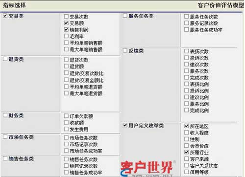 TurboCRM在長期支持CRM應(yīng)用實(shí)踐過程中,總結(jié)出一套完整實(shí)用的客戶價(jià)值評估模型,評估指標(biāo)包括交易類、財(cái)務(wù)類、服務(wù)類、反饋類、枚舉類、自定義指標(biāo)等(如圖),結(jié)合不同的指標(biāo)可以幫助企業(yè)評估客戶價(jià)值。