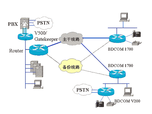 方案說明:以快速以太網(wǎng)口接入數(shù)據(jù)網(wǎng)絡(luò),V200-2FXO接本地PBX或直接連入PSTN,V200-2FXS直接提供兩路話音接入。