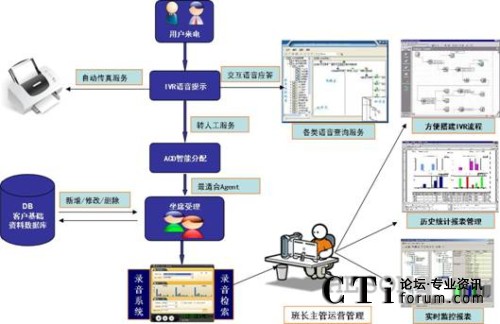 用戶電話呼入時(shí),系統(tǒng)通過自動(dòng)語音應(yīng)答的方式,實(shí)現(xiàn)用戶服務(wù)的自動(dòng)導(dǎo)航。交互式語音應(yīng)答功能自動(dòng)播放問候和語音提示信息,根據(jù)用戶按鍵選擇提供自助服務(wù)或者呼叫中心人工服務(wù)。呼叫中心提供人工服務(wù)后還可以為特定的用戶需求提供人工轉(zhuǎn)IVR自動(dòng)語音服務(wù),比如114查詢到電話、地址后,電信10000號呼叫中心提供的語音播放服務(wù)。