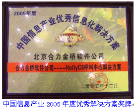 2006年1月10日,北京。中國計算機用戶協(xié)會"2005年度企業(yè)及產(chǎn)品頒獎典禮"在世紀金源大飯店隆重召開。在Call Center(呼叫中心)及CRM(客戶關系管理)領域位居業(yè)界領先地位的HOLLYCRM(合力金橋軟件)公司自主知識產(chǎn)權(quán)的HollyC6呼叫中心解決方案再度成為業(yè)界關注焦點,榮獲"中國信息產(chǎn)業(yè)2005年度優(yōu)秀解決方案"大獎。