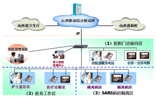 。。山西移動(dòng)通信公司在獲悉遠(yuǎn)程視訊業(yè)務(wù)可以有效預(yù)防SARS的情況下,隨即與山西省政府、省衛(wèi)生廳通電話,表達(dá)了山西移動(dòng)愿意為山西防治SARS工作提供更先進(jìn)的通信技術(shù)支持。山西移動(dòng)與華為技術(shù)有限公司旋即制定了“愛心連線”遠(yuǎn)程醫(yī)療、遠(yuǎn)程探視實(shí)施方案,省衛(wèi)生廳及下屬太原市7家醫(yī)院要求盡快實(shí)施。目前該系統(tǒng)已經(jīng)在山西省山大第一醫(yī)院開通,正值國家衛(wèi)生部SARS督察小組在山西各大醫(yī)院視察“防非”工作,整個(gè)系統(tǒng)運(yùn)行穩(wěn)定,在SARS的防治工作中發(fā)揮了重要作用。