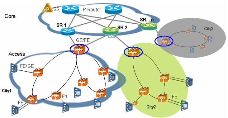 綜合接入主要關(guān)注語音和少量寬帶業(yè)務(wù)和專線,上行接口一般是E1和FE/GE。傳統(tǒng)窄帶語音業(yè)務(wù)、TDM專線等或MSAN使用于窄帶交換機組網(wǎng)的時候采用E1上行方式,其它時候采用FE/GE上行。接入層面采用的承載網(wǎng)設(shè)備必須同時能夠支持E1和FE/GE接入,因此承載網(wǎng)設(shè)備必須具備多業(yè)務(wù)傳輸特性,傳統(tǒng)SDH設(shè)備,傳統(tǒng)LANSwitch設(shè)備無法滿足組網(wǎng)需求。
