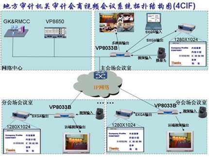 本系統(tǒng)在審計署機房配置網(wǎng)絡控制中心GK、多點資源管理系統(tǒng)和ViewPoint 8660 MCU設備。多點資源管理中心實現(xiàn)對MCU、電視會議和全網(wǎng)資源的統(tǒng)一調(diào)度,GK實現(xiàn)對IP終端入會時鑒權認證,在主會場會議室架設一臺ViewPoint 8033B分體式視訊終端。在各分會場會議室架設一臺ViewPoint 8033B分體式視訊終端;在所有會場各架設一臺標清攝像機、一個麥克風、一臺高清電視或一臺高清投影機。