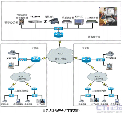 POLYCOM為統(tǒng)計局所設(shè)計的方案可召開最高2M帶寬的會議,可召開全網(wǎng)H.264協(xié)議下的視頻會議,全網(wǎng)設(shè)備均支持國際標準的H.239雙流技術(shù),并支持國際最新標準的G.722.1