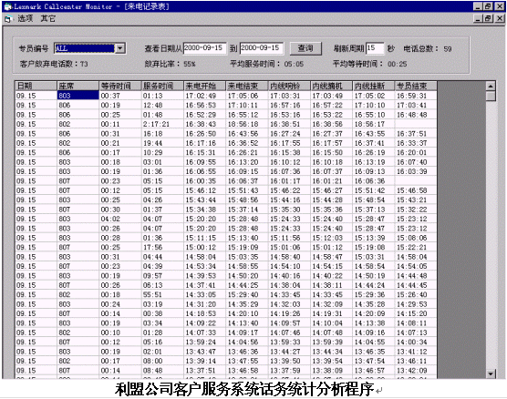 隨著利盟公司客戶(hù)服務(wù)系統(tǒng)的開(kāi)通,使傳統(tǒng)的電話(huà)服務(wù)提高到了一個(gè)新的階段;一方面借助客戶(hù)服務(wù)系統(tǒng)提供的統(tǒng)計(jì)分析功能,使客戶(hù)服務(wù)中心的績(jī)效考核更加準(zhǔn)確、高效和科學(xué);另一方面通過(guò)應(yīng)用先進(jìn)的信息技術(shù)和產(chǎn)品,可以極大地提高客戶(hù)服務(wù)的質(zhì)量、效率和滿(mǎn)意度,從而對(duì)提升公司形象,促進(jìn)產(chǎn)品銷(xiāo)售發(fā)揮積極的作用。