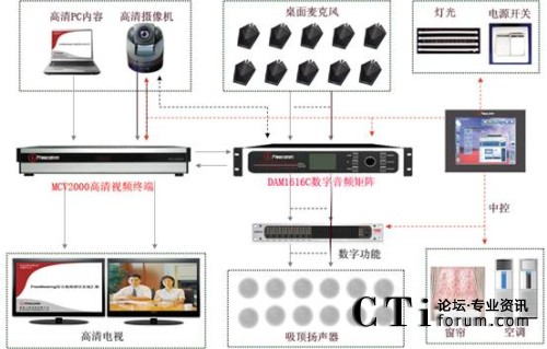 - 視頻終端和數(shù)字音頻矩陣通過(guò)控制接口和中控連接