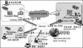 Tunneling)訪問因特網(wǎng)時,各遠(yuǎn)程/移動辦公室的Contivity必須加載防火墻許可證,以攔截來自因特網(wǎng)的攻擊,而在移動用戶的個人電腦上建議加載個人防火墻系統(tǒng)(如Sygate),以確保網(wǎng)絡(luò)安全。